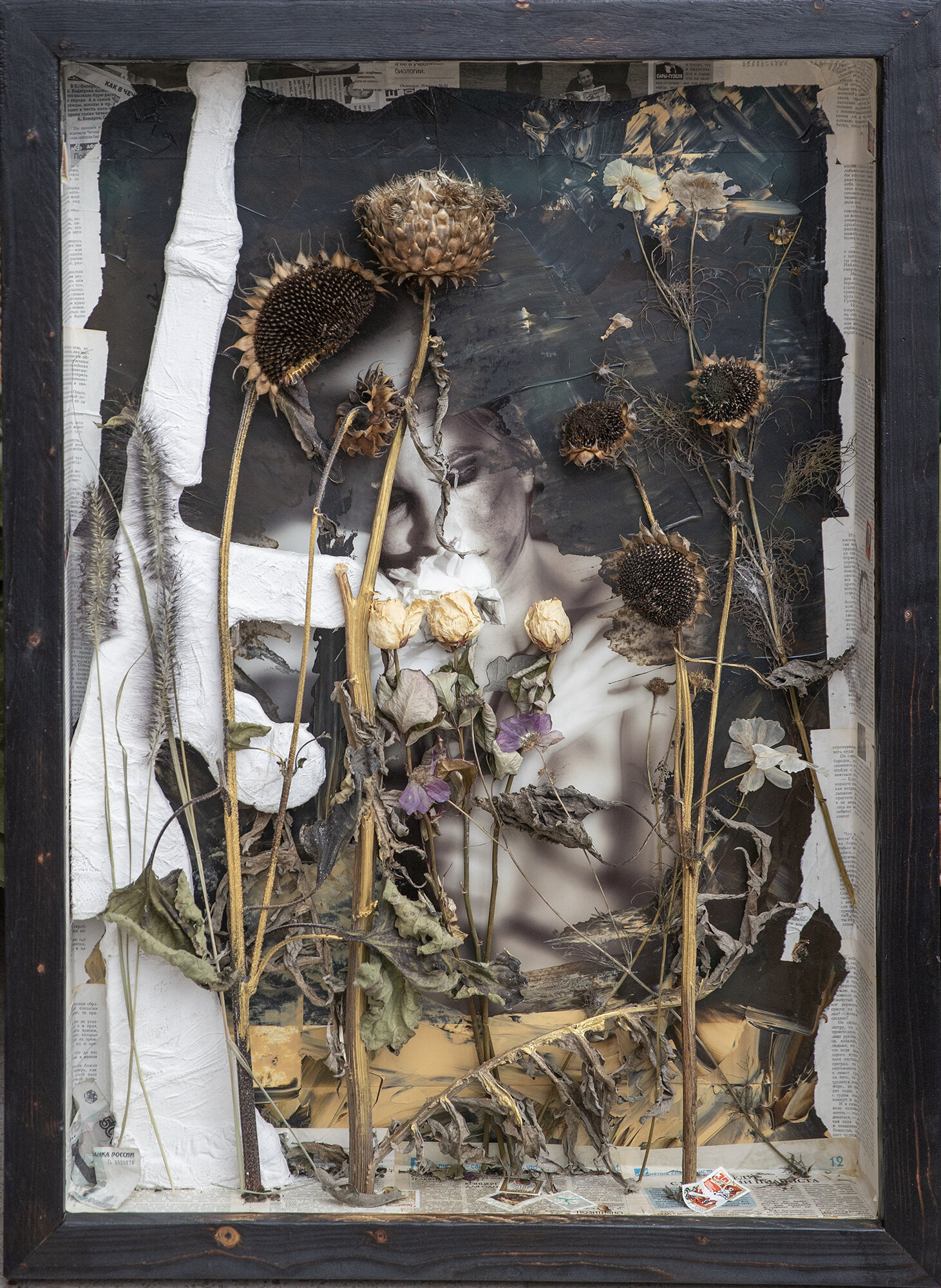De Oekraïense stad onder vuur. Een werk vol symbolen, omgeven door Russische kranten zie je een rouwende vrouw achter verdorde plantenresten.