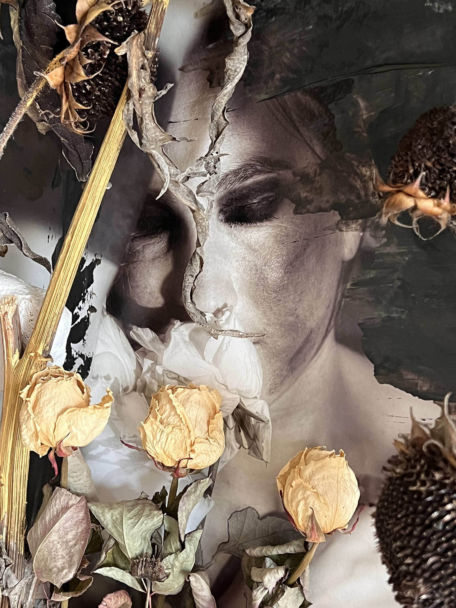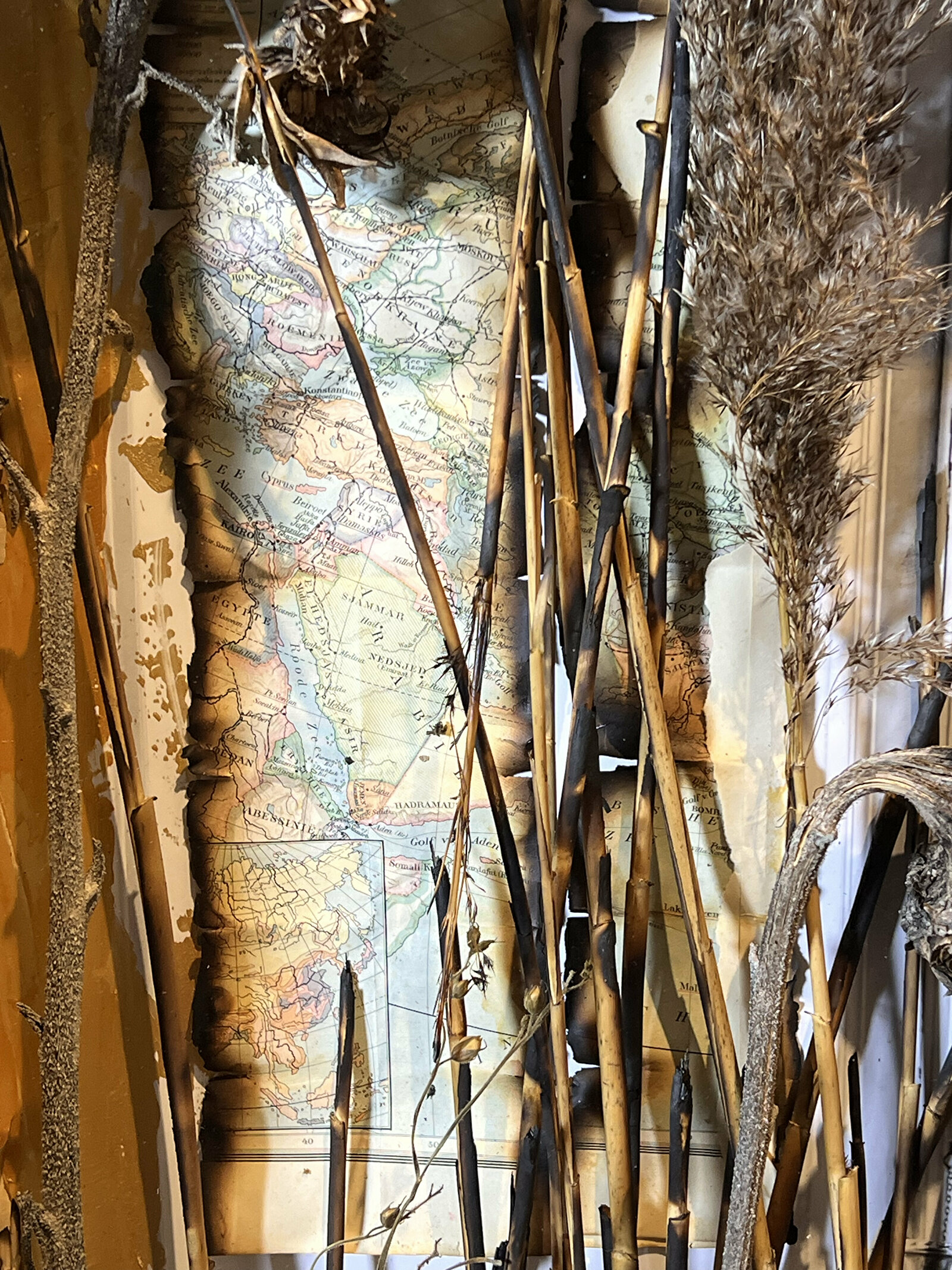 De Oekraïense stad onder vuur. Een werk vol symbolen, omgeven door Russische kranten zie je een rouwende vrouw achter verdorde plantenresten.